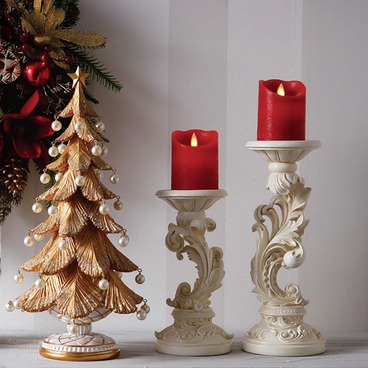 テーパーキャンドルもピラーキャンドルもセットできる、洗練されたフォルムと万能デザインが魅力のアイテム。アンティーク風ハンドペイントの上品な質感が、キャンドルを灯さなくても置くだけでリビングやダイニングのテーブルコーディネートを格上げします。光をともせば温かみのある空間を演出。
