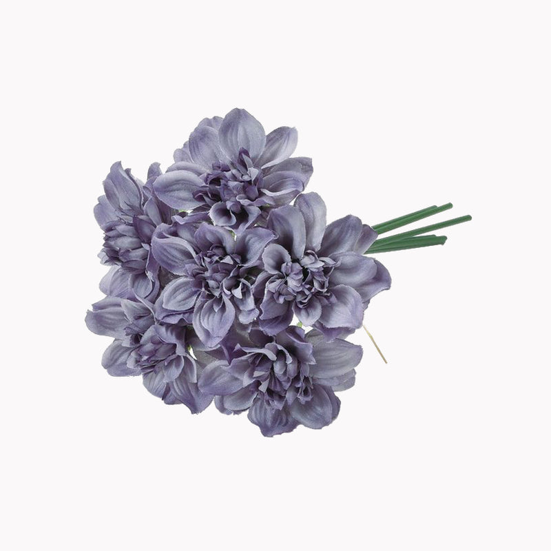 落ち着いたラベンダーカラーのダリア。アーティフィシャルフラワーならではのデザイン性のあるくすみカラー。他の花やグリーンなどにも見てやすい色味で、アレンジメントにも使いやすいです。