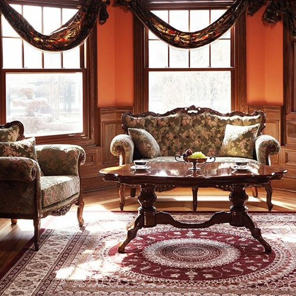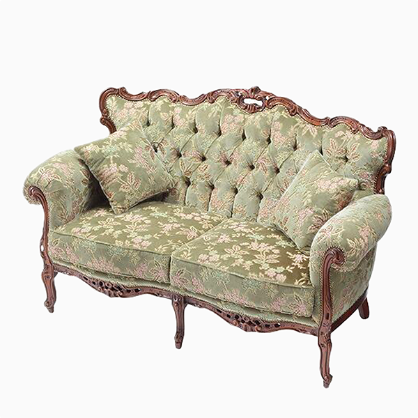 高貴で洗練されたデザインが、クラシックスタイルの美しさを残すところなく表現しています。 天然木を使用したフレームには、手作業で彫刻された精巧な装飾が施され、贅沢感と格式を演出。 アーム部分の細くなった曲線とディテールが、ヨーロッパ宮廷家具の伝統を感じさせます。 シートと展望には、品のあるグリーンカラーのファブリックを採用し、繊細なフローラルパターンが華やかさをプラス。