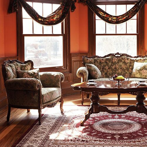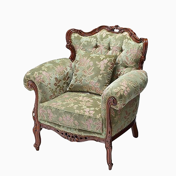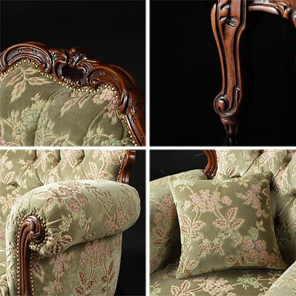 天然木を使用したフレームには、手作業で彫刻された精巧な装飾が施され、贅沢感と格式を演出。シートと背もたれには、品のあるグリーンカラーのファブリックを採用し、繊細なフローラルパターンが華やかさをプラス。クラシックなボタン留めが、上品な雰囲気を一層引き立てています。