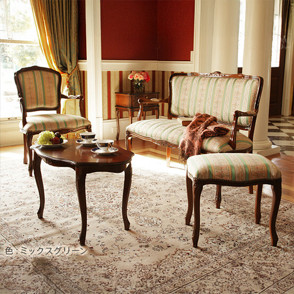 職人の手による繊細な彫刻と、クラシカルなデザインが魅力的な一品です。座面は高品質な張地を使用しており、見た目だけでなく座り心地も抜群です。5色展開からお好みのカラーをお選びいただけます。どの色も空間を美しく彩り、アクセントとしても存在感を放ちます。
