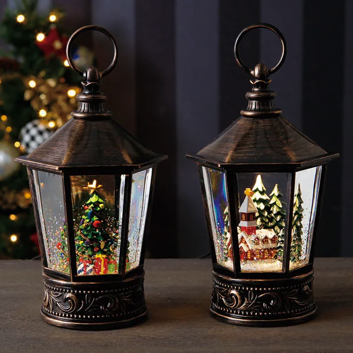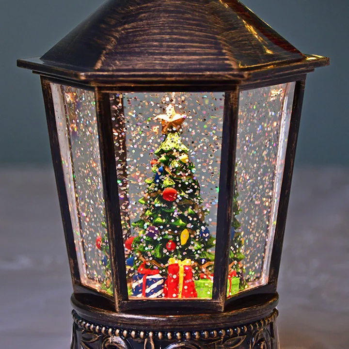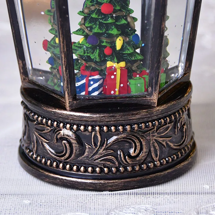 ランタン型のスノードーム。ツリーの周りにプレゼントが並び、クリスマスの雰囲気を演出します。スイッチを入れると中のグリッターがキラキラと舞い幻想的な光を放ちます。