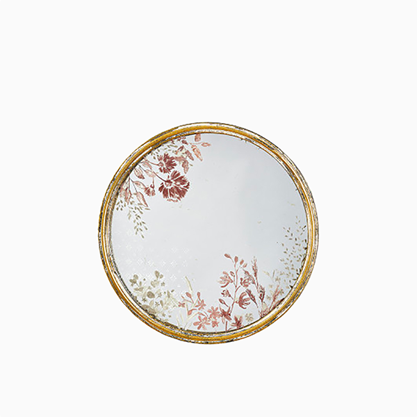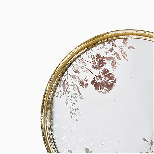 アンティークゴールドのフレームは、年月が経つにつれて味わいを増し、温かみのある雰囲気を醸し出します。ミラーの中央に描かれた繊細な花柄は、光の当たり方によって表情を変え、見る角度によって様々な魅力を発見できます。