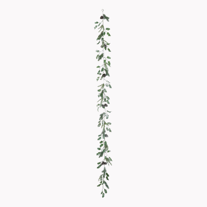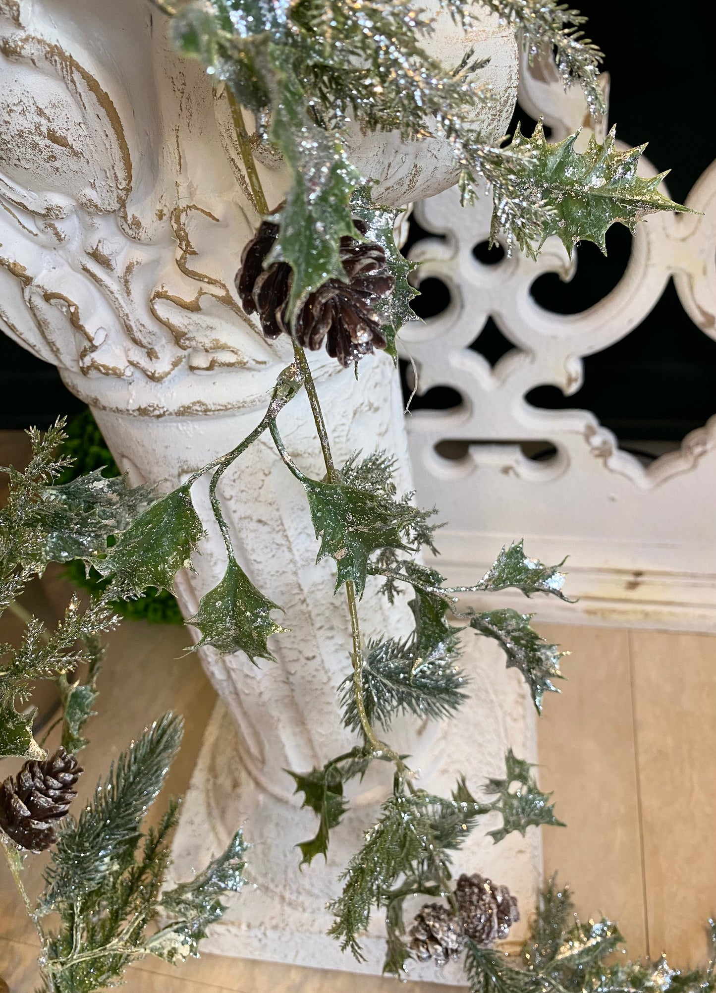 シルバーラメ加工された松ぼっくりとヒイラギの葉が程よく散りばめられたパインガーランド。 柔らかな動きを表現しやすく、クリスマスシーズンのアレンジメントや空間装飾に最適です。