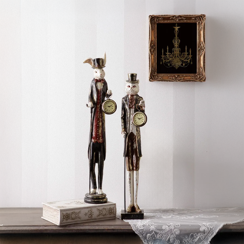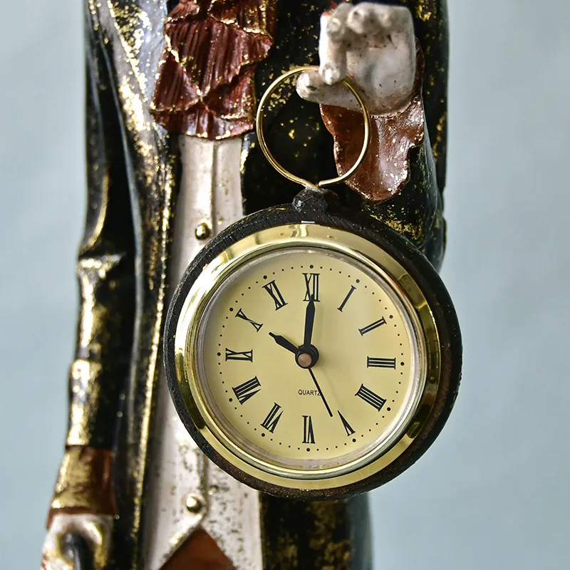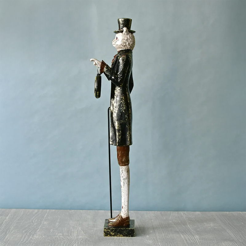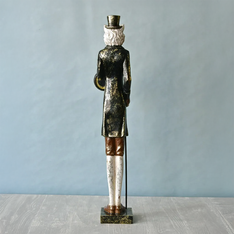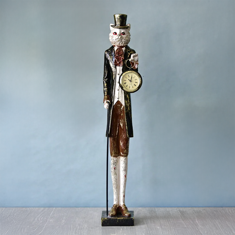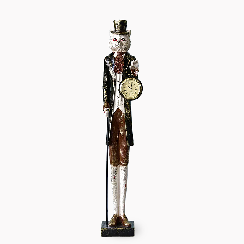 ハットにステッキ、時計を携えた古典的な紳士の雰囲気のスリムなネコの置物。 インテリアに個性を加え、時間を確認する楽しみとともに日常に彩りを添えます。