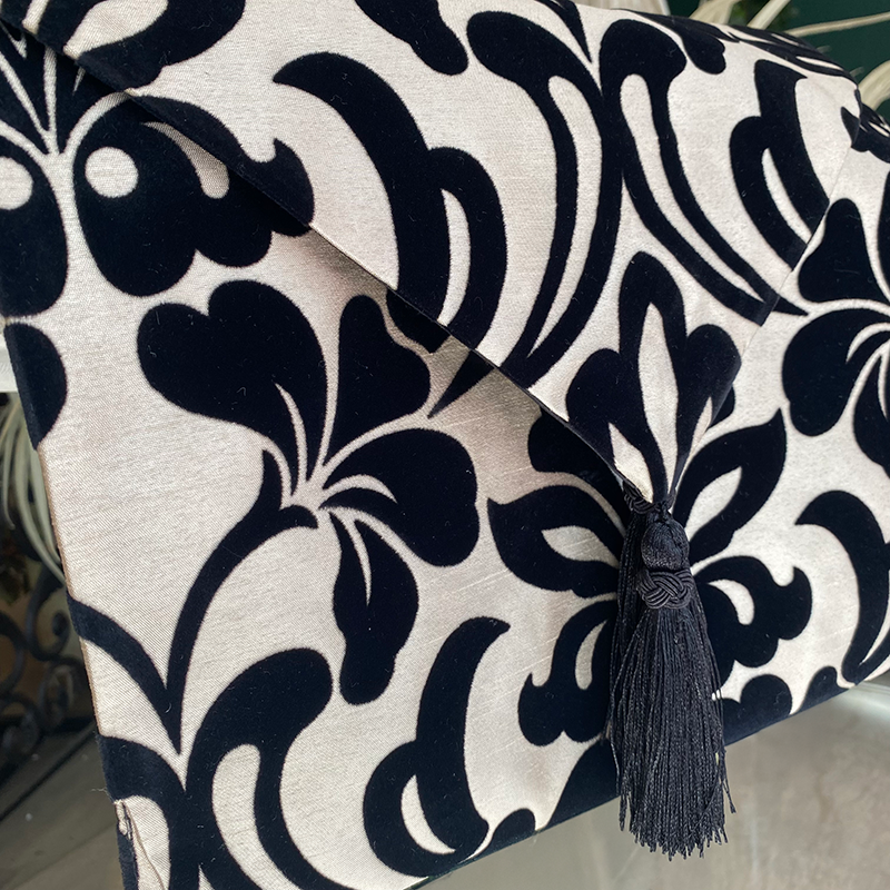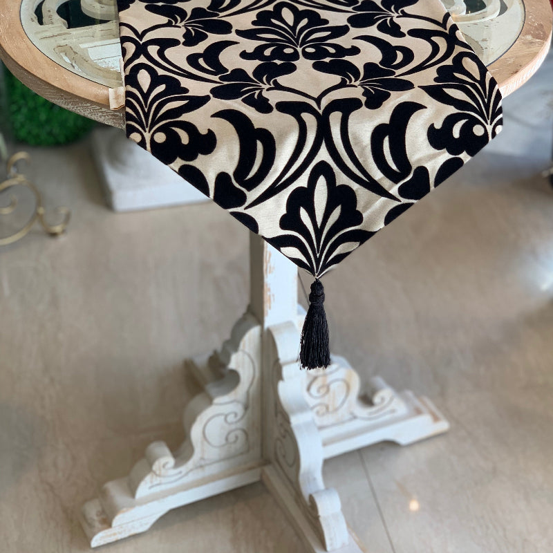 アメリカの高級ブランド、ジェニファーテイラーのテーブルランナー。 上品なダマスク模様と華やかなタッセルが特徴です。 エレガントで高級感のあるデザインで、お部屋より素敵に演出します。モダンでシックな雰囲気がお好きな方にお勧めです。