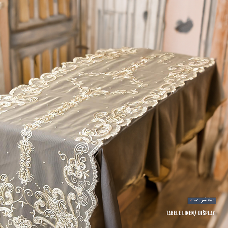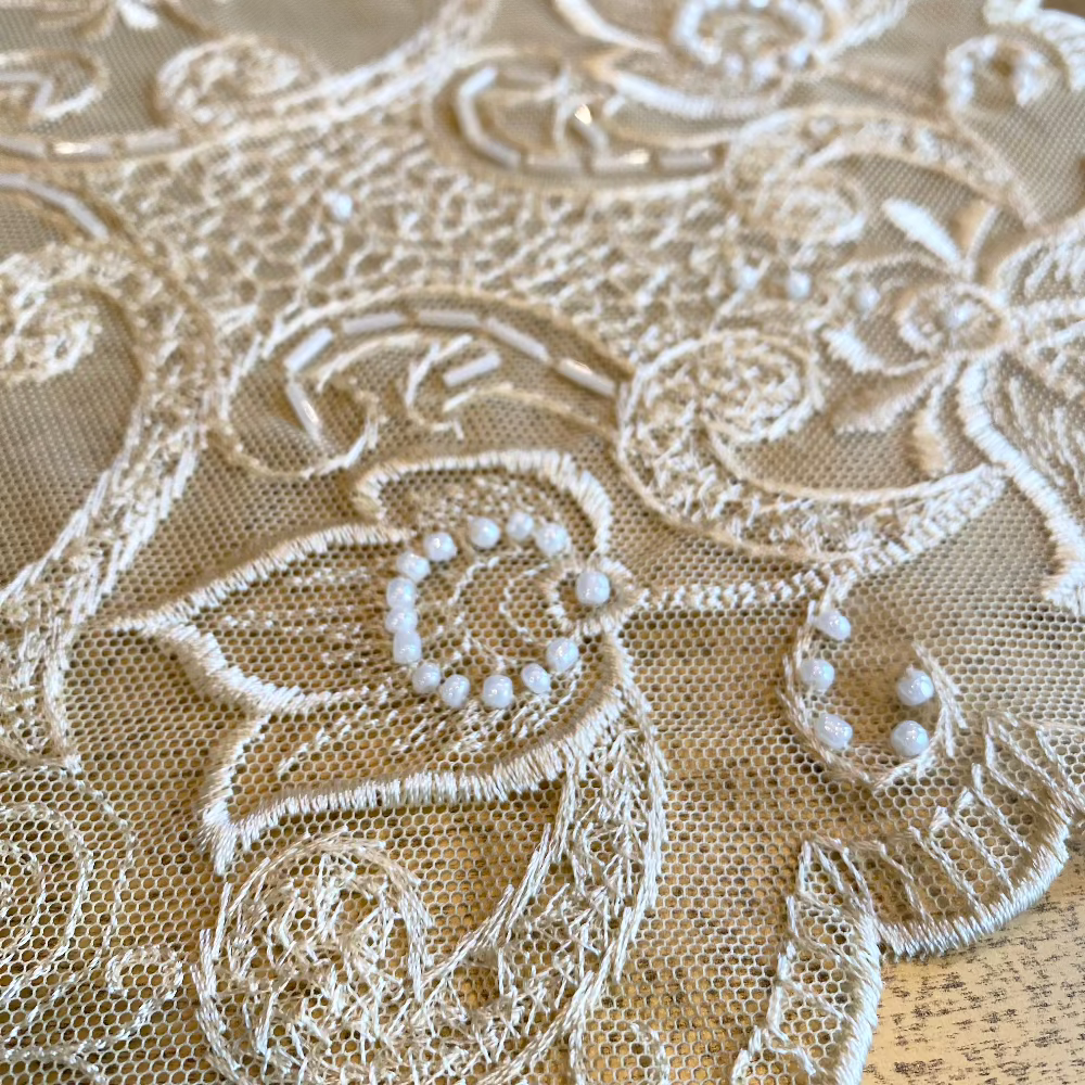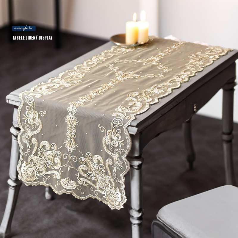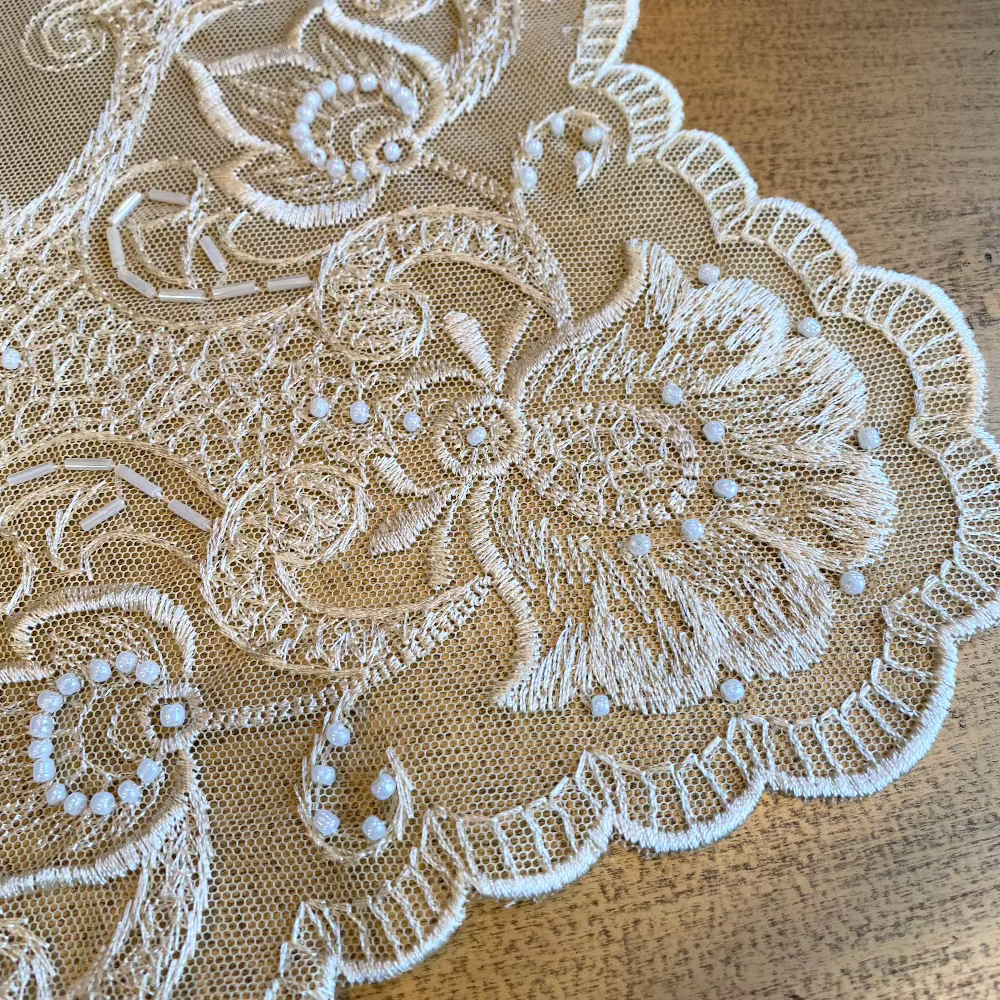 ギリシャ製のチュールレースのテーブルランナー。洗練されたベージュカラー 繊細なアラベスク模様が編まれたレースに、ビーズ装飾をあしらった、クラシカルで高級感のあるテーブルランナー。 総レースのランナーは、カラークロスとの重ね使いによって様々な表情を楽しめます。